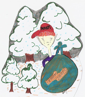 Alpin had a dilemma. The sack of lemon drops the apothecary had given him was as large as a two year old giant.Carrying it home through the woods during a snow storm was being no mean task. He had tried dragging it behind him, but the pebbles and rocks on the ground had made a hole in the bag and some of the candy had fallen out. Also, the bag was getting soggy. As was the candy.