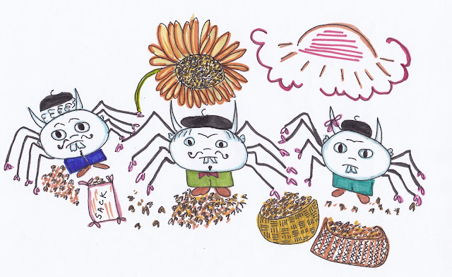 Next Uncle Gentlerain then drew a square in the air with his index finger. A glass case appeared floating just where he had drawn its outline. Within it a much magnified creature was trapped. It had eight black arms like a spider. They grew out of its back and ended in pincers large in proportion to reach for sunflower seeds with. The creature had a short, broad torso out of which grew two little feet and a large flat head with a pale face as round as the full moon that had two white horns on it. When the creature wanted to fly, its balloon-like head lit up like a light bulb and lifted it in the air. By moving its arms, it advanced swimming in the direction of its choice. Its eyes were just as round as its face, with beady black pupils, and it also had teeth cracked from cracking sunflower seeds. The only resemblance the pipnosher bore to its supposed father, Petey, was in the clothes it wore. On its round head rested a black beret.